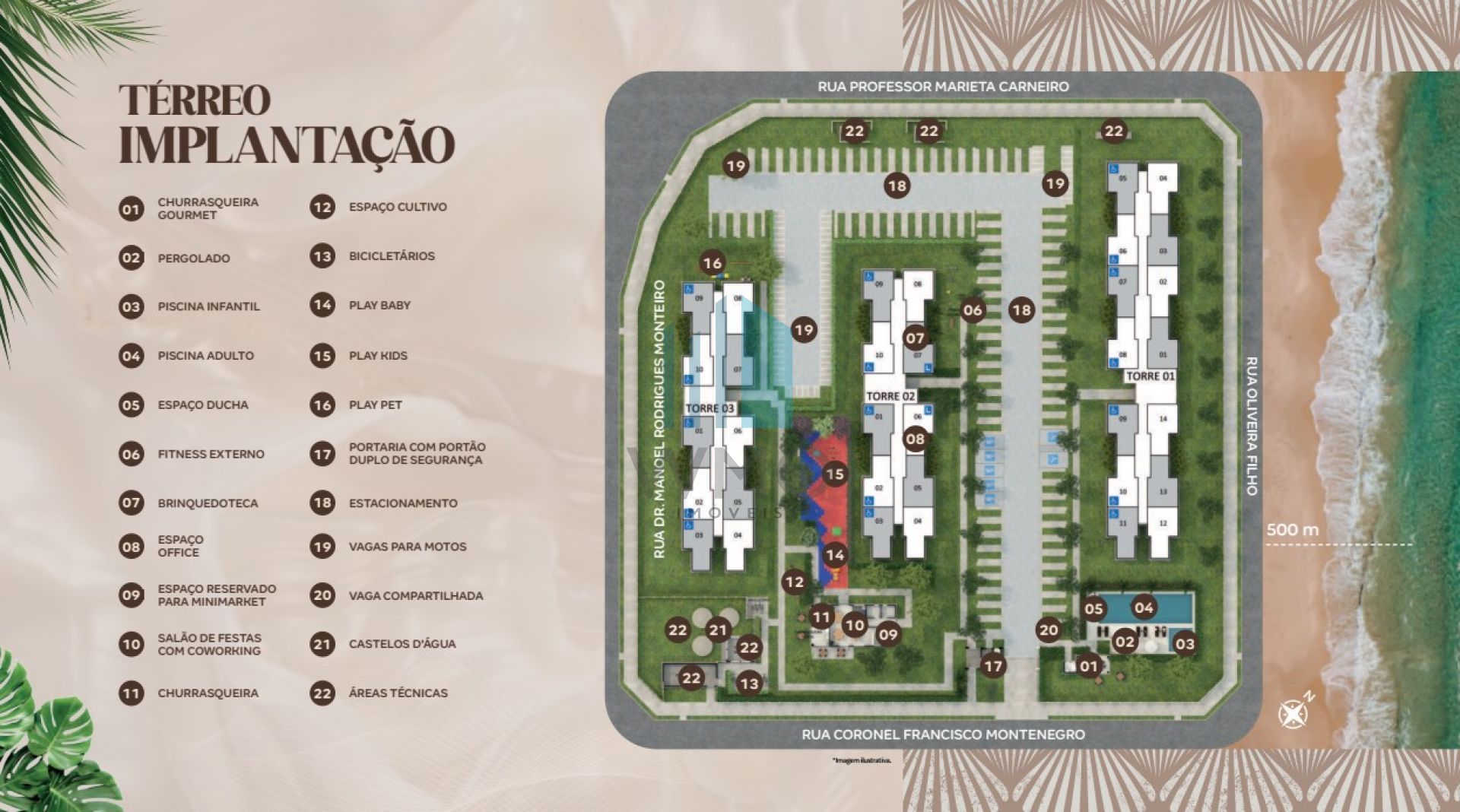 2 Elevadores em Cada Torre Torre 1 e 2 com 10 Apartamentos por Andar Torre 3 com 12 Apartamentos por Andar Total de Apartamentos: 508 Unidades Térreo + 14 Andares